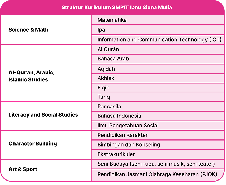 Kurikulum SMPIT Ibnu Siena Mulia dirancang untuk membangun fondasi akademik kuat dan karakter kokoh. Pembelajaran aktif dan menyenangkan berfokus pada penguatan konsep, literasi, komunikasi, dan adab. Materi umum dan keislaman terpadu kontekstual-kolaboratif, dilengkapi program Leadership Project, Public Speaking, dan Karya Tulis Remaja untuk mengembangkan potensi dan percaya diri siswa sejak dini.